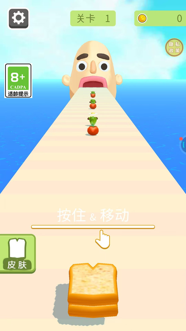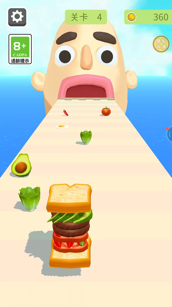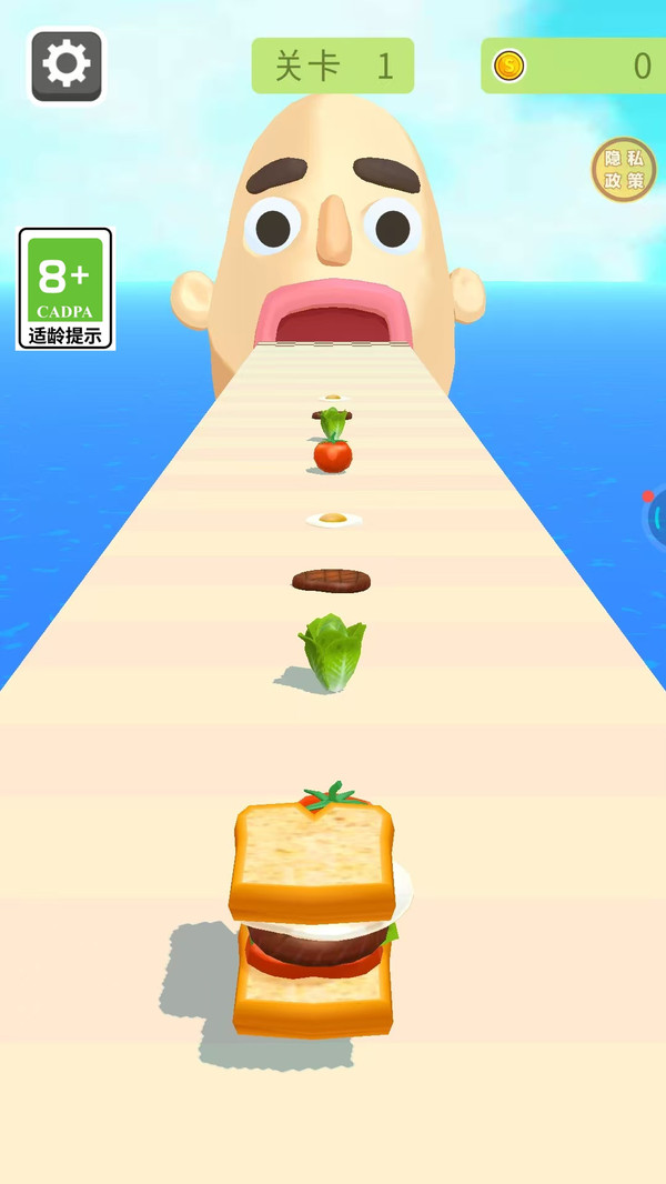 游戏的操作简单易上手,玩家只需通过滑动屏幕来操控面包片的左右移动,轻松加入各种食材,制作汉堡的过程充满了乐趣。