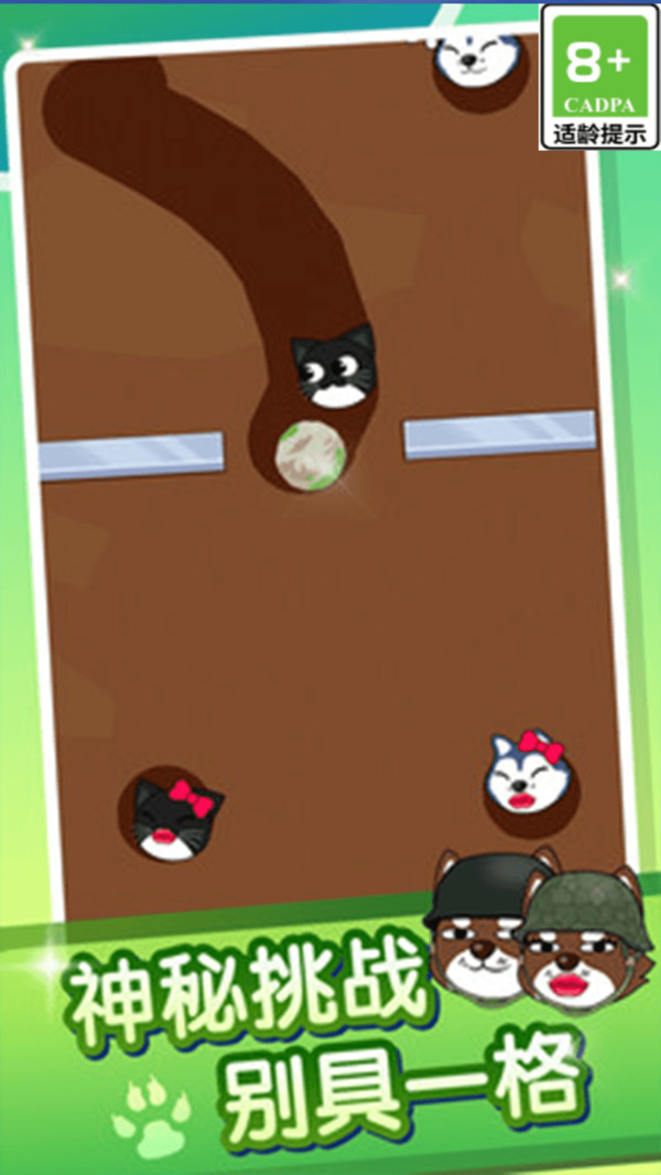 1、挖掘泥土是游戏的核心,玩家需要通过滑动手指来挖掘出泥土,寻找隐藏的道具和通道,帮助狗蛋们顺利前进。