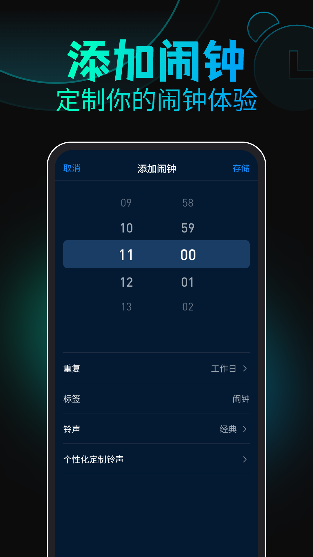 2. 点击添加闹钟按钮,进入设置页面,您可以选择一次性或周期性闹钟。
