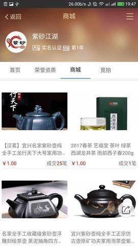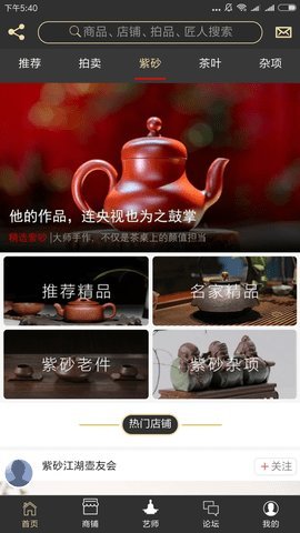 1、下载并安装紫砂江湖app,打开应用后即可看到首页展示的热门商品和竞拍信息。