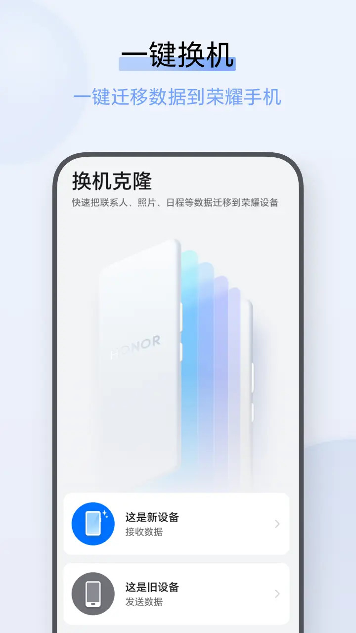 换机克隆是一款由荣耀官方推出的便捷数据迁移工具,帮助用户轻松实现手机之间的数据转移。无论是更换到新手机,还是在旧手机上清理数据,换机克隆都能高效地将联系人、短信、照片、音乐、视频及应用等重要信息快速迁移到荣耀新手机,确保用户在换机过程中不会丢失任何重要数据。特别适合需要频繁更换手机的用户,尤其是荣耀品牌的忠实用户,它解决了用户在换机时数据迁移繁琐的问题,让换机变得轻松而无忧。