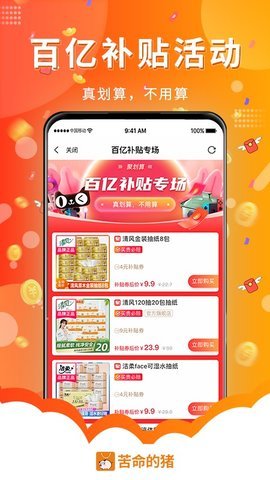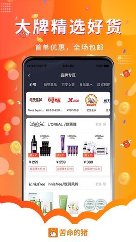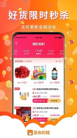 1、打开苦命的猪App,用户会看到首页展示的热门商品和最新优惠券。
