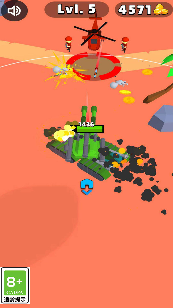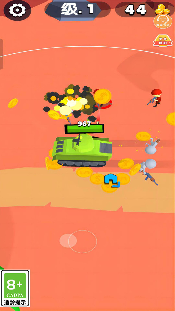 我是坦克王是一款充满激情与策略的战斗游戏,玩家将化身为一位指挥官,带领自己的坦克部队在战场上展开激烈的对抗。游戏的核心在于通过精准的战术安排和灵活的指挥,粉碎敌方的坦克与士兵,最终赢得胜利。雇佣和管理一支强大的军队,升级自己的基地与坦克,逐步提升战斗力,面对越来越强大的敌人。