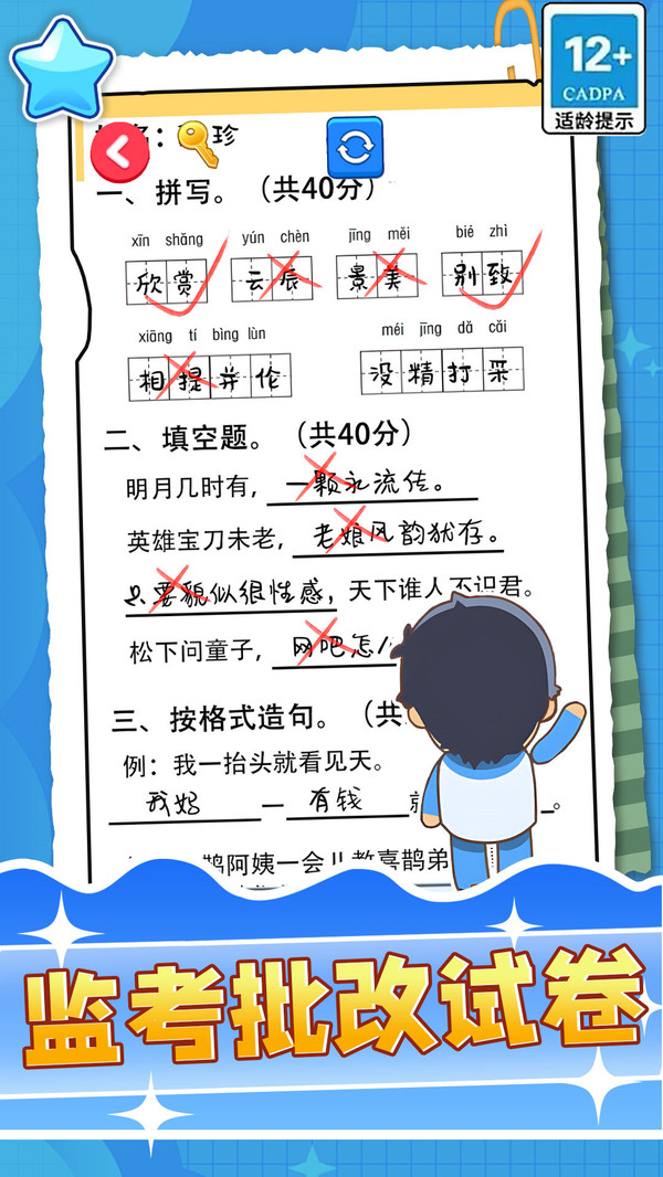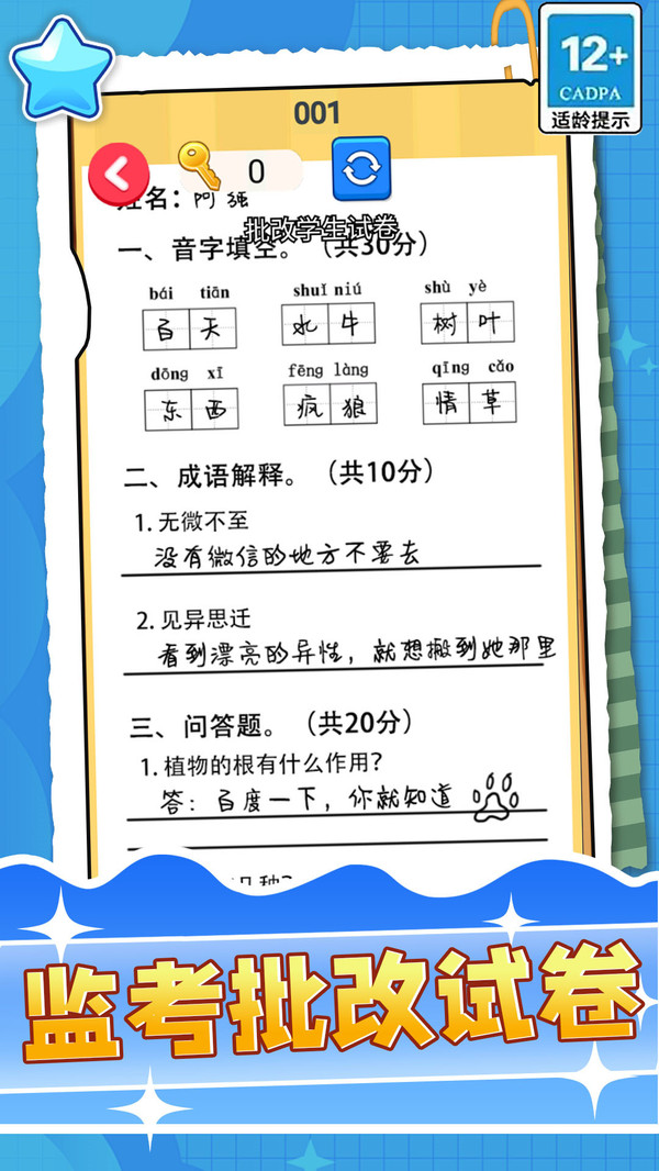 这款游戏的背景设定在一个虚拟的学校环境中,玩家将化身为一名监考老师,负责批改来自不同学生的试卷。试卷题型多样,涵盖数学、语文、科学等多个学科,玩家需要根据题目的要求,认真审阅每一个答案。除了批改试卷,游戏还设计了多种模式,根据自己的兴趣选择不同的挑战。游戏的节奏感十分良好,既能让玩家享受思考的乐趣,又不会让人感到疲惫。