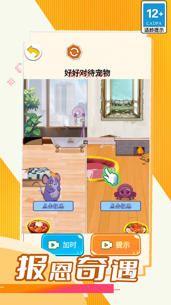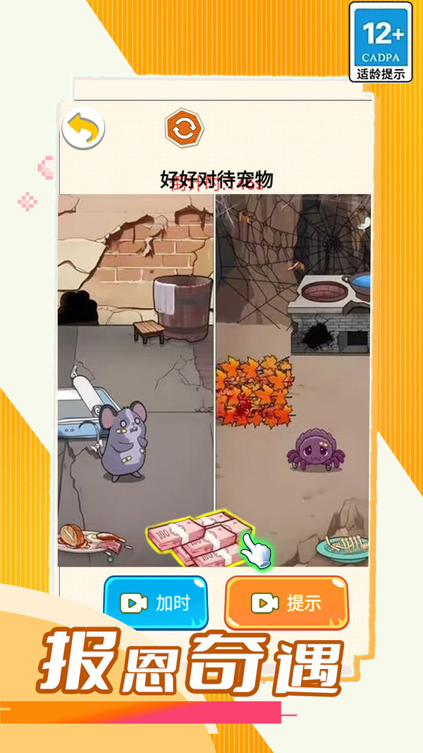 报恩奇遇是一款温馨的休闲解谜养成游戏,玩家将通过互动与解谜,帮助动物过上更好的生活。游戏的核心机制是通过与可爱的动物角色进行互动,解开各种谜题,以此推动故事的发展。玩家的目标是通过解决动物们面临的问题,提升它们的生活质量,享受与动物们之间的深厚情感联系。
