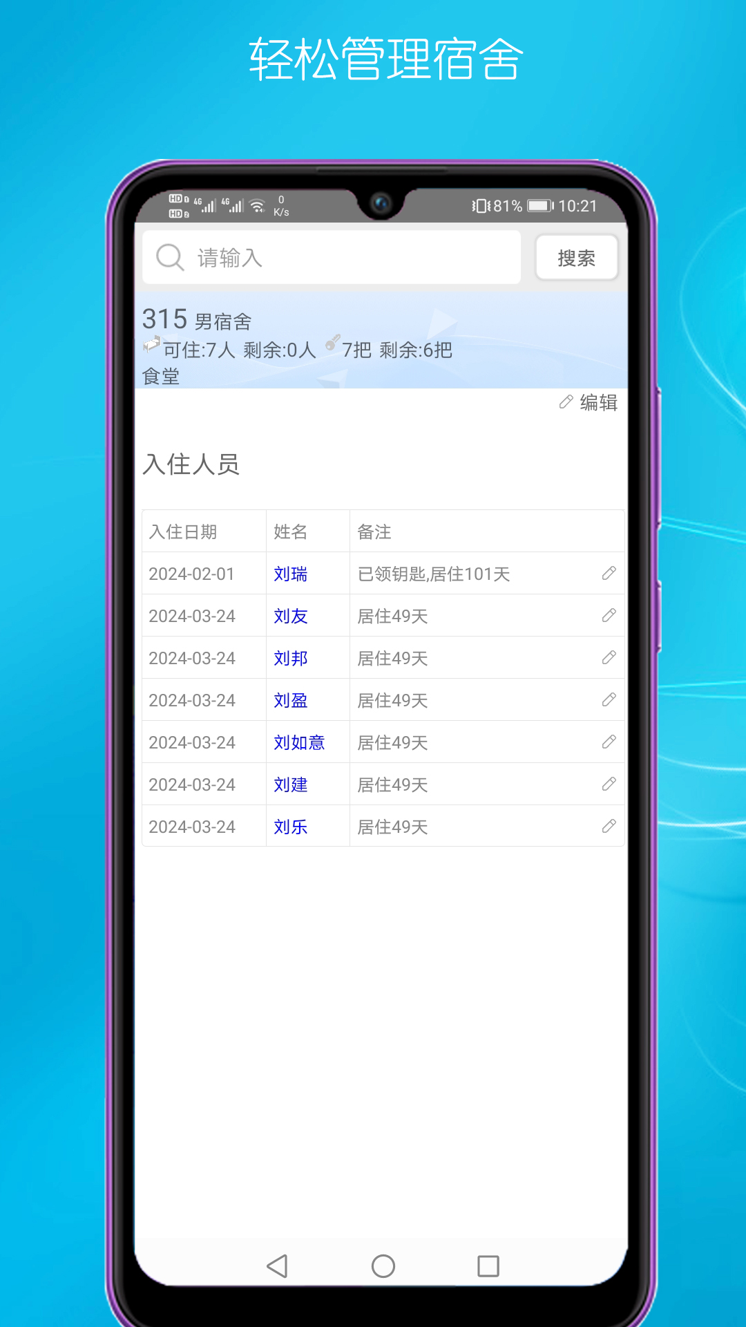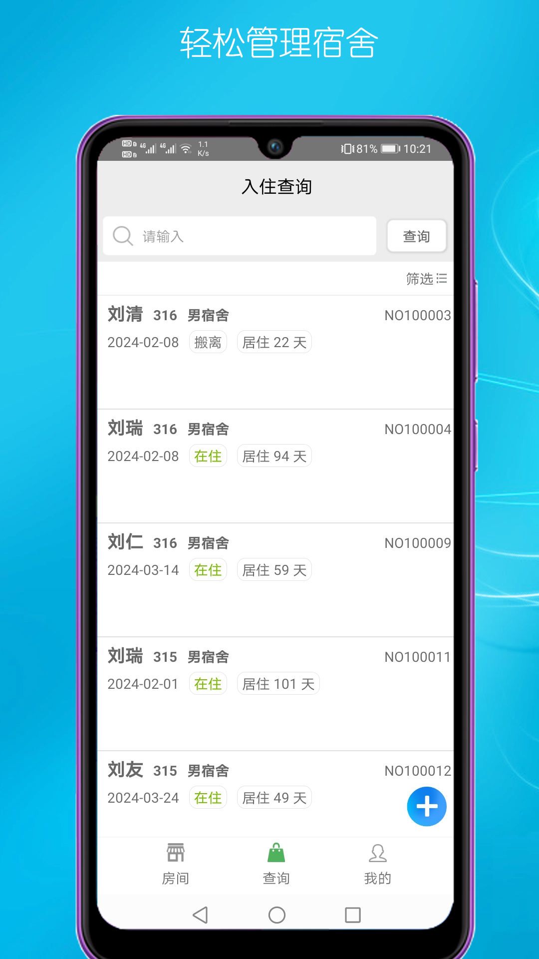 员工信息管理:支持员工的基本信息录入与管理,方便跟踪每位员工的入住和搬出情况,提升管理效率。