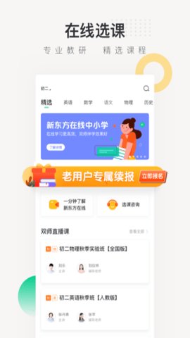 新东方在线app是一款专为中小学生设计的学习软件,旨在为他们提供一个高效的网络学习平台。该软件涵盖了小学、初中和高中各个学科的课程,包括数学、语文、英语等,能够满足不同年级学生的学习需求。通过在线直播课程,学生可以与老师及同学进行实时互动,解决学习过程中遇到的问题,提升学习效果。