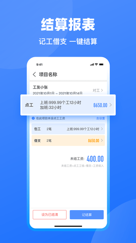 1、借支结算情况的记录功能。工友可以随时记录接活干活但尚未结算的工资情况,替代传统的纸质记账方式,避免记录丢失问题,使记工记账数据清晰明了。