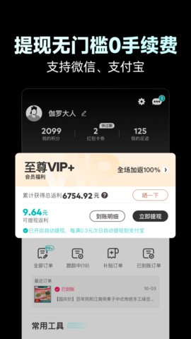 3、部分通过软件下单的购物,后续会产生一定比例的返利,这笔返利可以累积并申请提取到个人账户。