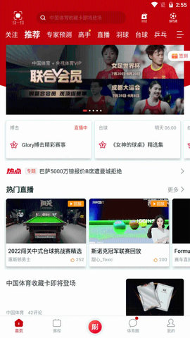 1、进入直播页面后,左右滑动屏幕可切换不同赛事分类,如乒乓球、羽毛球或赛车。