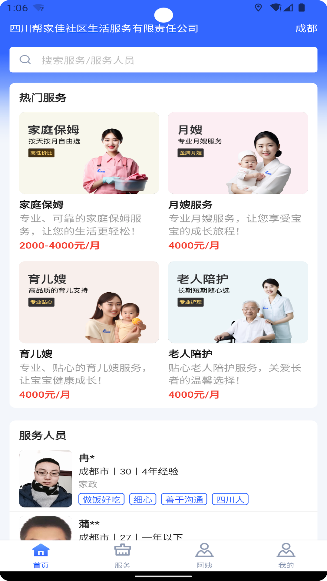 1. 打开帮家嘉App,用户将看到首页的服务分类,选择所需的家庭服务类型。