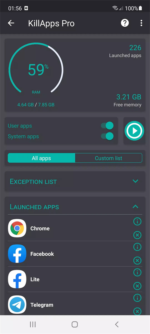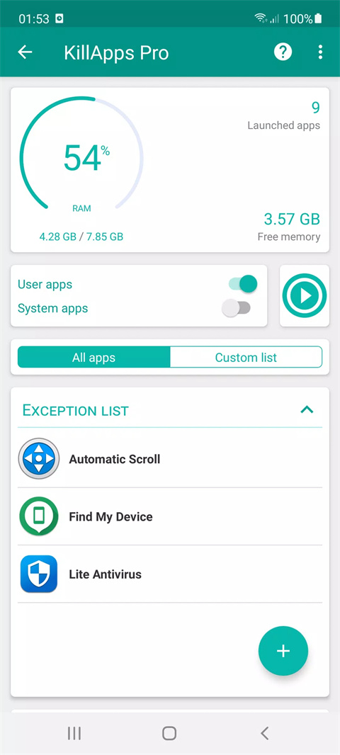 2、为了提升用户体验,KillApps提供了自定义列表功能,根据自己的需求选择关闭哪些应用,避免误杀重要软件,真正实现个性化管理。