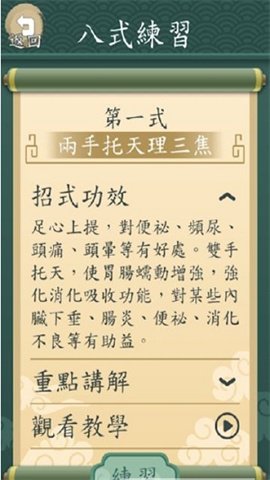 3、丰富的学习资源:系统内置专业的八段锦教学视频,通过观看这些视频,深入理解每个动作的要领和练习方法,提升自己的技能。