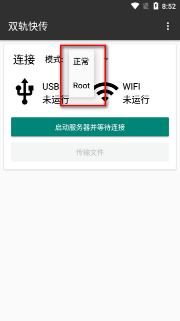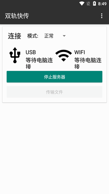 2、启动手机端应用后选择传输模式,点击服务器启动按钮,待界面显示等待电脑连接状态。