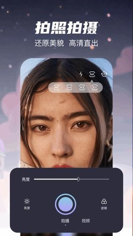 1、打开APP,首先进入相机功能模块,调节亮度等参数,根据需要选择滤镜,随时拍摄记录生活中的精彩瞬间。
