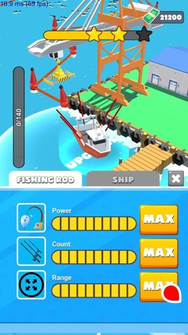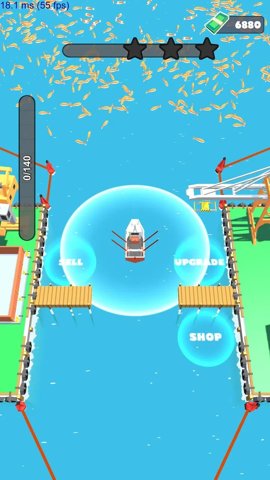 捕鱼的过程十分简单,玩家只需滑动屏幕控制船只的移动,靠近鱼群后,使用渔网进行捕捉。渔网的长度和宽度将直接影响捕获的数量,因此选择合适的渔网至关重要。捕获的鱼类可以在商店中出售,获得金币。在经营过程中,玩家还可以通过市场的变化,选择最佳的销售时机,让你的收益最大化。