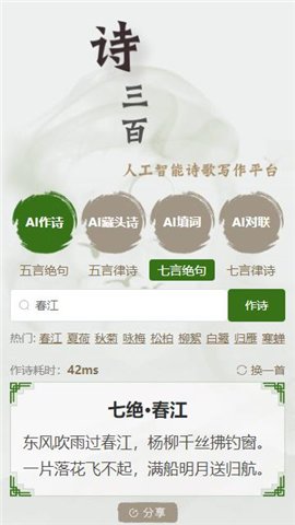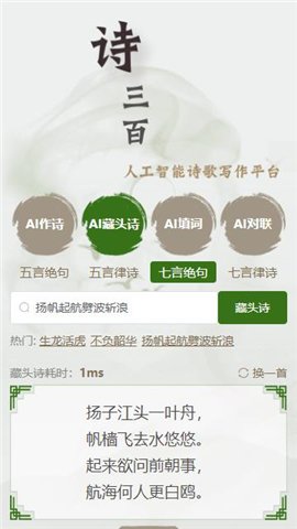 诗三百AI作诗是一款专为诗词爱好者设计的创新应用,致力于帮助用户在现代科技的辅助下,轻松创作出优美的诗篇。无论是五言绝句还是七言律诗,这款软件都能为你提供灵感和创作支持,适合各个层次的写作需求。能够帮助用户提升写作技巧,还能让你在愉悦的创作过程中,感受到中华诗词的独特魅力。