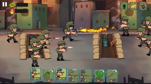 战争部队2是一款让人热血沸腾的战争题材放置游戏,玩家在游戏中需要充分发挥自己的战略思维,招募和升级军队,制定出最佳的作战计划。游戏的核心在于占领敌人的战壕和士兵,通过合理的资源管理和战斗策略,逐步推进自己的领土。在这个过程中,您将面临来自敌人的各种挑战,必须善用军官、士兵和各种武器装备,确保自己的战壕安全并击败敌人。随着游戏的深入,敌人会变得更加强大,因此升级部队和装备显得尤为重要。整个游戏充满了紧张刺激的战斗体验和策略性挑战,让您全身心沉浸在军事战争的世界中。