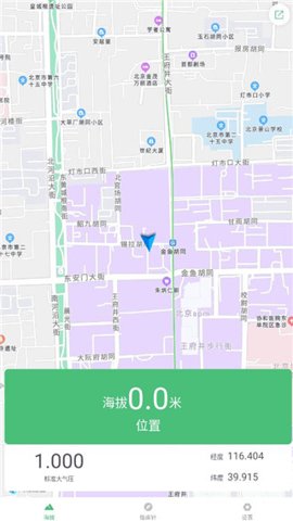 2、只需打开定位功能,软件就会自动测量并显示当前位置的海拔高度、大气压值、经纬度等参数。