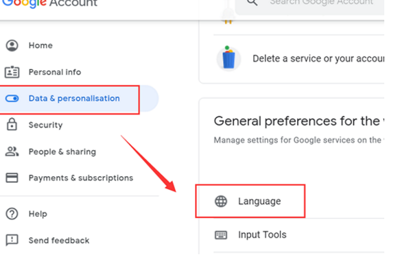 进入账号页面后,在左侧菜单中找到并点击 “Data & privacy”(数据和隐私),然后向下滚动,选择 “Language”(语言) 选项