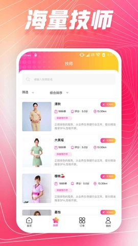 3、平台提供详细的技师信息展示,包括技师的专业背景、服务项目及用户评价,帮助用户做出明智的选择。
