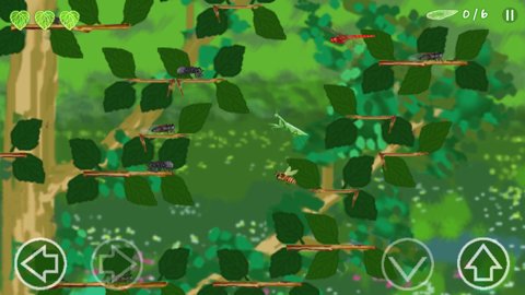 在螳螂猎手中,玩家的目标是通过捕猎小虫和知了来获取食物。游戏操作简单,通过左右方向键控制螳螂的移动,短按跳跃按钮进行普通跳跃,长按则可以实现二段跳,帮助你越过障碍物或躲避敌人。玩家在捕猎时需要观察周围的环境,选择合适的时机发起攻击,确保能成功捕捉猎物。
