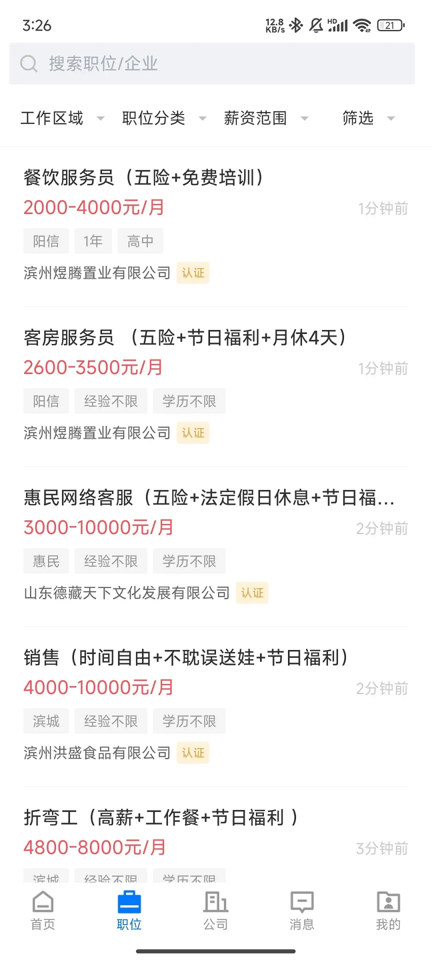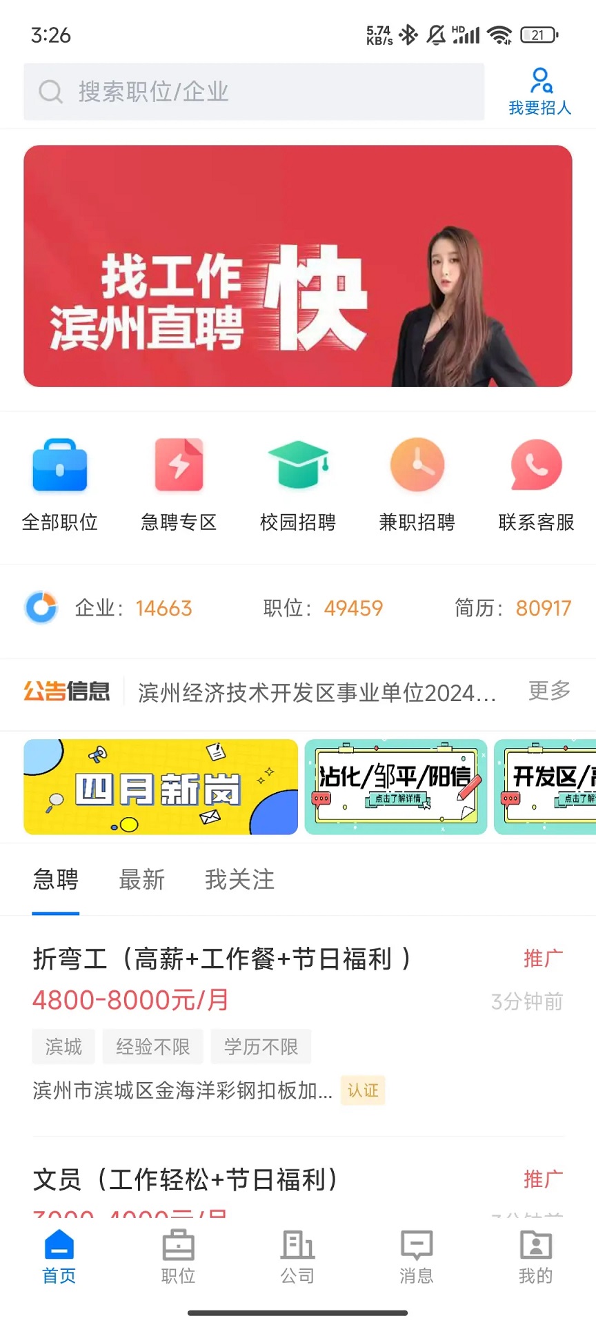 1. 打开滨州直聘应用,进入首页后可以看到最新的招聘信息和热门职位推荐。