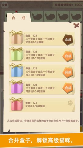 4、每个礼盒的开启都有可能带来惊喜,玩家可以期待不同类型的猫咪,增加了游戏的多样性。