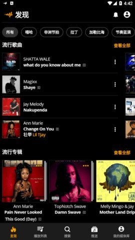 1、首先,打开Audiomack中文版应用,您将看到一个简洁的主界面,展示了推荐的音乐和播放列表。