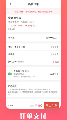 一旦购买电影票后,系统不支持退票,请在购票前仔细确认选择的影片和座位。