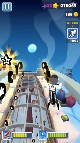 3、在雪地版中,除了常规的跑酷元素,玩家还会遇到特殊的道具,这些道具能够帮助角色在关键时刻获得加速或保护,增加了游戏的策略性。
