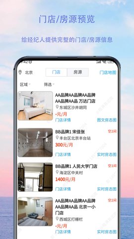 4、门店和房源的全面预览,提供详细的房源信息和图片,帮助经纪人更好地向客户展示房产。