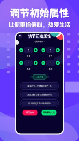 游戏中,玩家需要不断点击以推动人生的进程。通过点击,你可以获取资源和属性点,进而提升角色的能力。每当你获得足够的属性点时,可以选择将其分配到智力、体质、颜值等不同属性上,帮助你达成设定的人生目标。