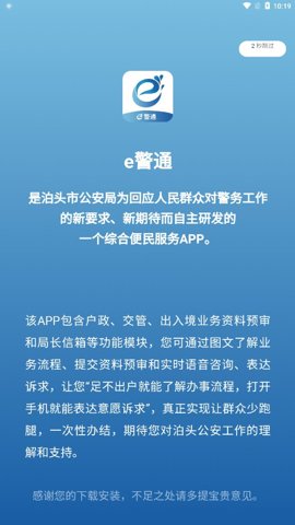 在手机应用商店中搜索“泊头市e警通”,点击下载并安装,安装完成后即可注册使用。