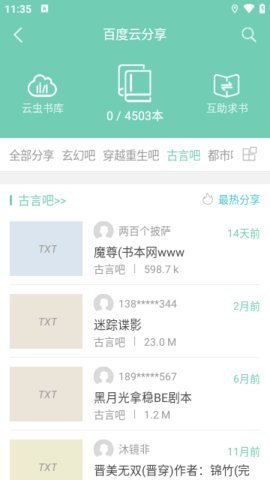 2、云虫爱看Pro提供了百度云共享的小说资源,书友之间能够互相分享,轻松获取超过百万本的免费小说。
