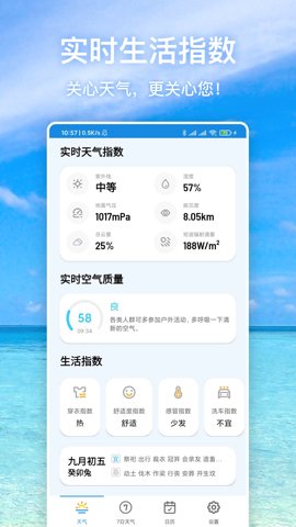 在主界面中找到生活指数模块,点击进入即可查看实时更新的紫外线、空气质量等指数,帮助您合理安排生活。