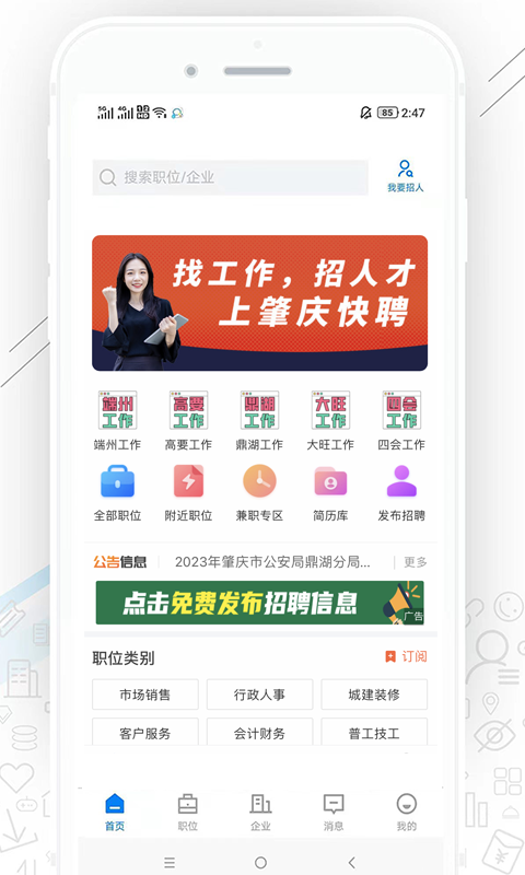 肇庆快聘是一款专为肇庆地区求职者和企业量身打造的招聘平台。为求职者提供丰富的本地招聘信息,还为企业搭建了高效的招聘渠道。无论你是刚步入职场的新人,还是希望转行的职场老手,这里都能满足你的需求。通过肇庆快聘,求职者能够快速找到适合自己的工作,企业也能轻松找到合适的人才,从而实现双赢的局面。
