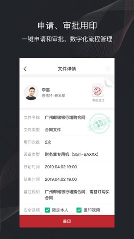 2、线上盖印功能,印章持有者可以在确认文件无误后,直接通过手机进行盖章,省去传统盖章的麻烦。