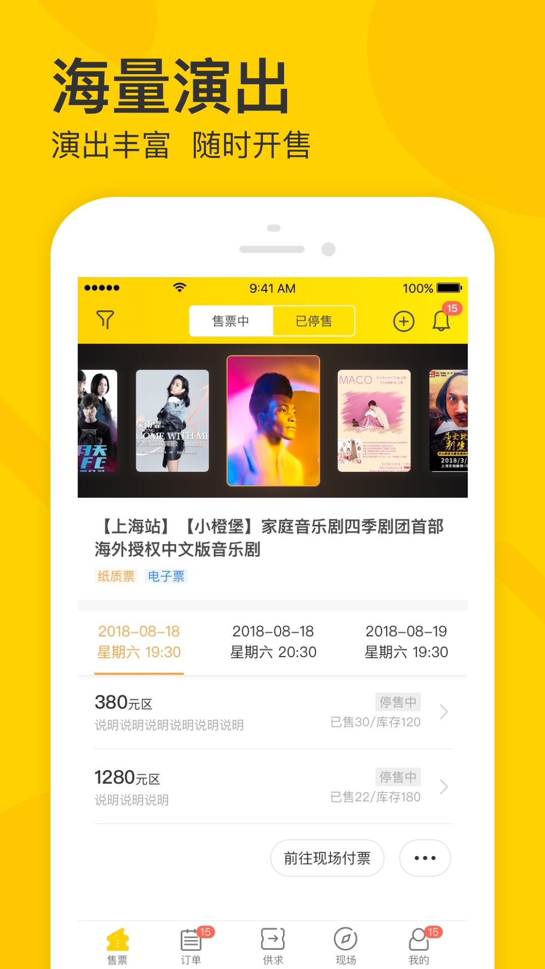 2、在票务发布页面,依次选择演出类别、填写具体的场次详情、上传票面凭证并设定售价。