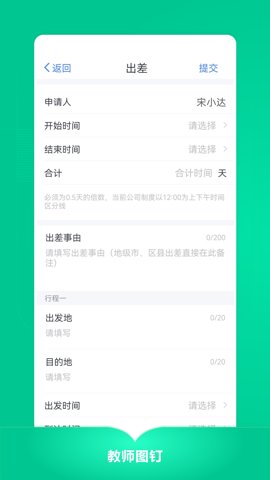 4、教师们可以通过教师图钉快速发起各类流程,如请假、报销、调课等,无需再填写繁琐的纸质表单,只需在手机上轻轻一点即可完成。