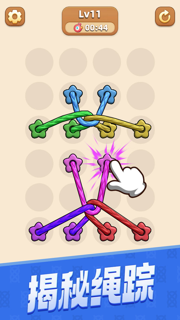 1、玩家在进入游戏后,会看到一组交错的绳子,目标就是将它们逐一解开。你需要仔细观察绳子的交叉情况,找到最佳的解开顺序,以免造成更复杂的交错。