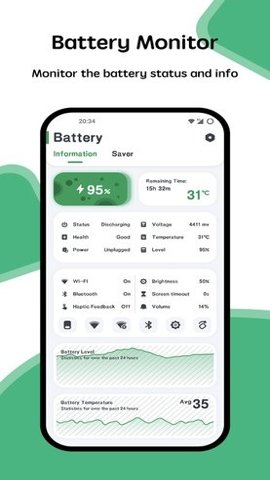 2、这款应用还支持监测电池温度和其他详细信息,如电压、健康程度、剩余电量和剩余等。
