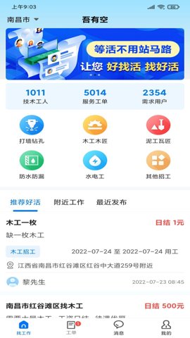 吾有空APP是一款专为灵活用工市场打造的应用,致力于为用户提供便捷的在线发单和接单服务。无论你是寻找零工的雇主,还是希望接活的技师,这款应用都能满足你的需求。让招工和找活变得更加简单,还省去了中介费用,真正实现了省心省钱的目标。通过吾有空,随时随地在线沟通、发布信息,轻松找到合适的工作或雇佣到合适的人才。