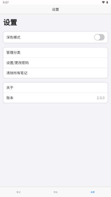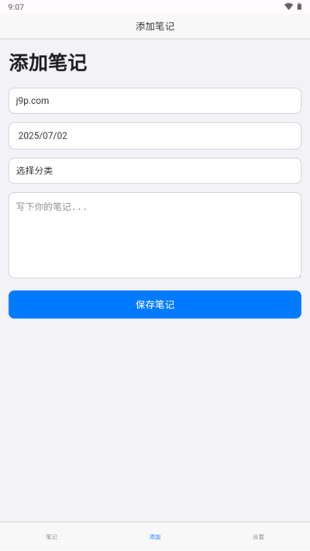 4、若需添加新的笔记分类,进入设置页面,选择添加笔记分类,输入分类名称,点击添加即可。