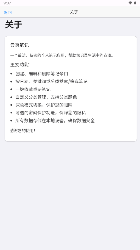 云落笔记是一款专为记录生活点滴而设计的移动端笔记工具,帮助用户高效整理和管理各种信息。它支持创建、编辑及删除笔记,轻松分类和标记重要内容,确保在繁忙的生活中不遗漏任何重要信息。通过关键词、日期或分类的搜索功能,能够快速找到所需的笔记,提升工作和生活的效率。简洁直观的界面设计使得操作变得简单明了,用户无需经历繁琐的过程,便能迅速上手,专注于记录内容本身。可选的密码保护功能为用户的隐私提供了强有力的保障,所有笔记数据存储在本地设备,确保信息安全,避免外部泄露的风险。