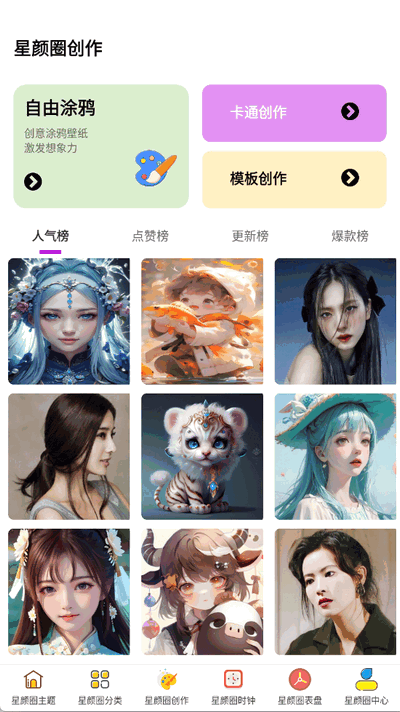 2、个性化创作模块提供自由涂鸦、卡通创作和模板创作等多种工具,用户能够根据个人喜好进行设计,制作出独一无二的壁纸。