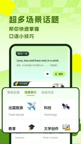 1、内置大量贴近日常生活的对话场景,从点餐到商务会议,覆盖范围广泛。