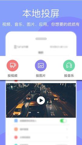 1、将手机中的视频、音乐和图片等本地资源投射到电视上观看,享受更大的视野和更好的音效。