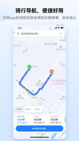 该应用的导航信息可以实时投屏到电动车的显示屏上,用户在骑行过程中无需低头看手机,确保了安全性与专注度。