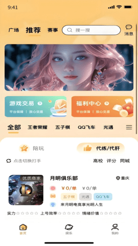 2、在主界面根据需求选择找陪玩或找代练入口,进入后利用顶部的筛选标签,比如按游戏名称或高校认证等条件,快速缩小寻找范围。